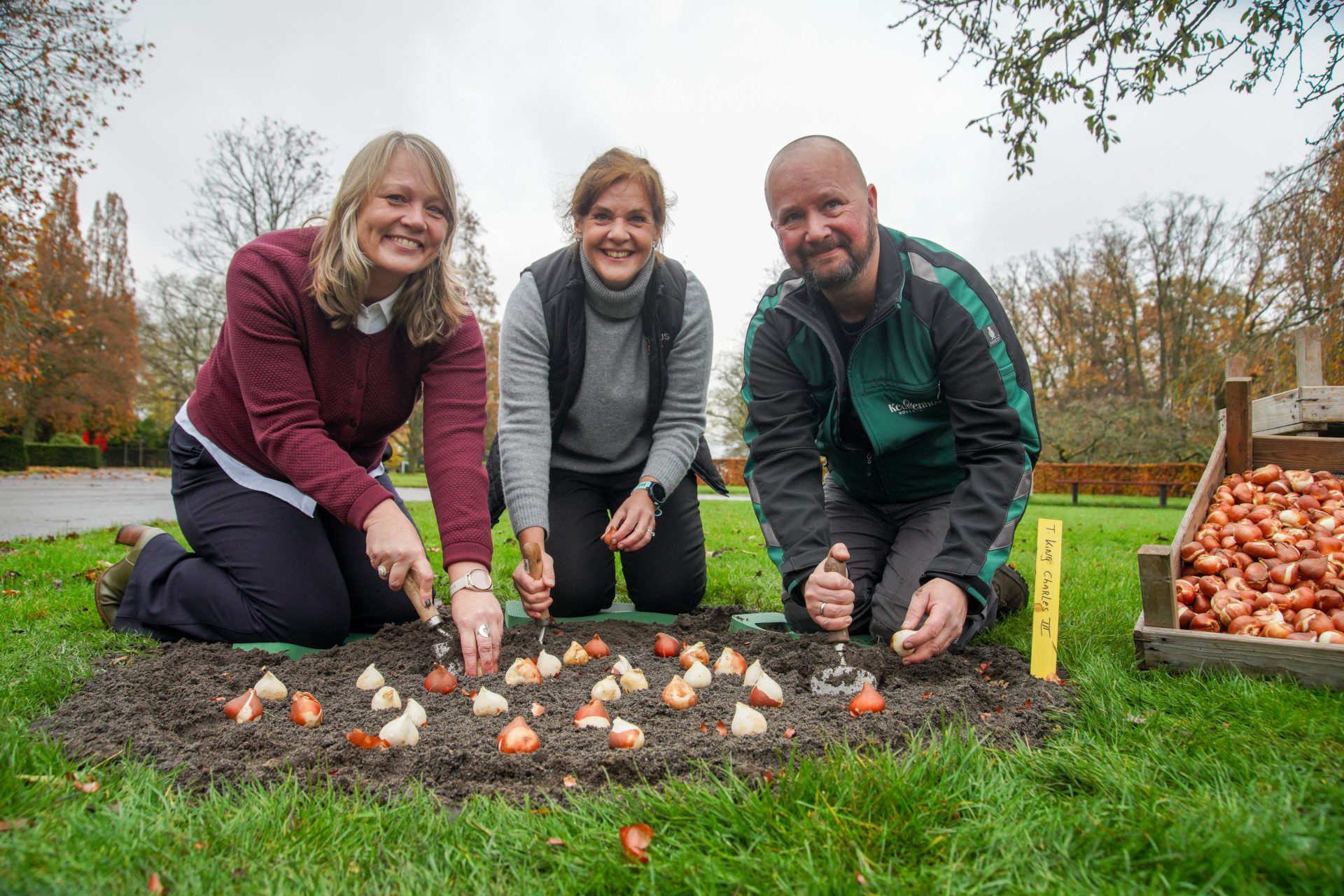 Dit najaar heeft H.E. Joanna Roper, ambassadeur van het Verenigd Koninkrijk in Nederland, samen met Keukenhof-directeur Sandra Bechtholt en tuinman Patrick van Dijk de tulipa King Charles lll geplant. In het voorjaar komt deze goudgele tulp tot bloei.