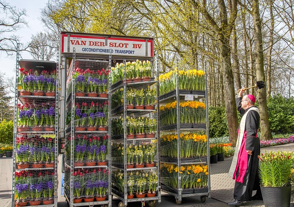 Vandaag is het transport met bloemen voor het Sint-Pietersplein vertrokken vanuit Lisse. Mgr. Van den Hende, bisschop van Rotterdam en voorzitter van de Nederlandse Bisschoppencon-ferentie, kwam naar Keukenhof om de bloemen te zegenen voor vertrek.