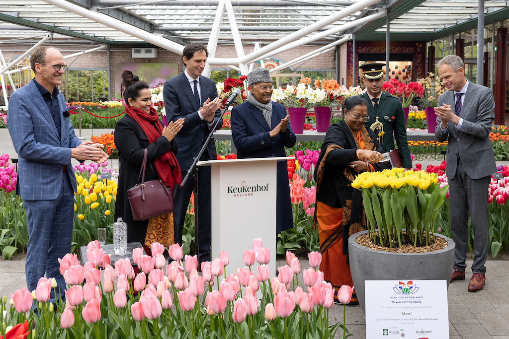 President Kovind, aanwezig in Nederland voor een officieel staatsbezoek, vindt het een genoegen om in Nederland te zijn. “Ik leg dit staatsbezoek af ter gelegenheid van de 75e verjaardag van de diplomatieke betrekkingen tussen onze twee landen. Vandaag zal er een nieuwe bloem bloeien voor de relaties tussen India en Nederland. We noemen de tulp ‘Maitri’, wat in het Sanskriet vriendschap betekent. Het zal ons inspireren om te werken aan het versterken van vriendschapsrelaties en banden tussen mensen uit India en Nederland”.